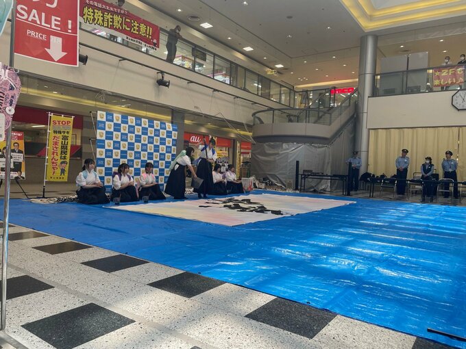 富山高校の書道部の生徒6人が参加し、アピタ富山店で買い物客に詐欺被害防止を呼びかけました。