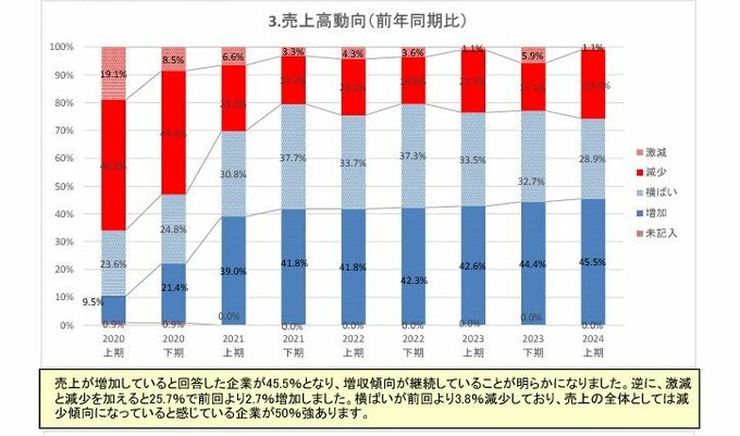 調査結果によりますと、売上高が「増加している」と回答した企業は前年比1.1ポイント増の45.5%、「横ばい」は3.8ポイント減の28.9%、「激減または減少」は2.7ポイント増の25.7%となりました。