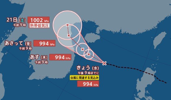 ニュースクリップ 【台風情報 18日午前10時半更新】ダブル台風へ 南シナ海の “台風のたまご” 今夜にも台風15号に発達か【雨風シミュレーション】大型の台風14号は今夜にも沖縄に最接近 2024年9月18日(水) 10:56 国内 天気 今夜にも台風15号へ…熱帯低気圧が発達 一方、南シナ海にある熱帯低気圧は12時間以内に台風へ発達する見込みです。18日午前9時の時点で1時間に25kmの速さで西へ進んでいます。