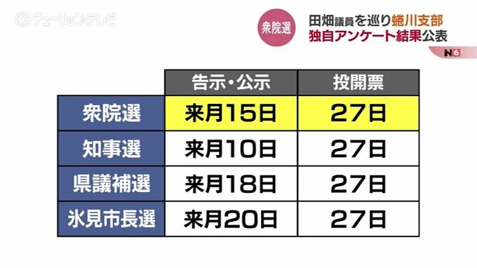 衆院選の富山1区をめぐっては、今月8日、富山市連が田畑議員を公認候補として推すことを決めましたが、この決定に唯一反対した蜷川支部が支部の党員の声を聞くとしてアンケートを独自に実施しました。