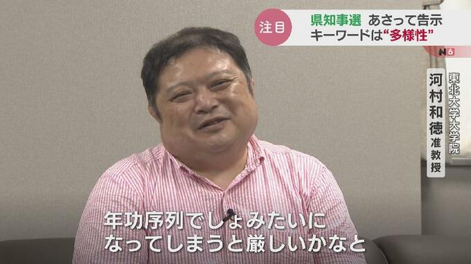 東北大学大学院 河村和徳准教「UターンもJターンも含めた形で、挑戦的にある種、関東・中京・関西に留学していた人をどうやってもう1回呼び戻すのかというところが県政課題であるし、そのときに女性とか多様性のある社会といったものが、提示されていないとさすがになかなか帰ってもどうせ男性が中心なんでしょとかって話になっちゃったり、年功序列でしょみたいになってしまうと厳しいかなと」