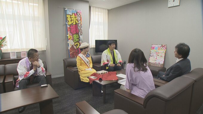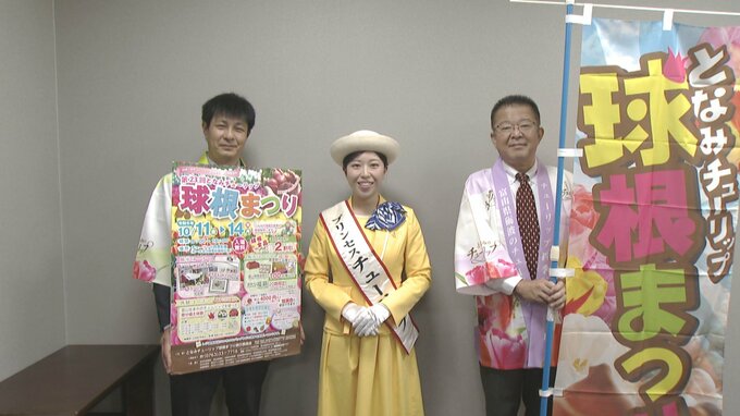 富山県砺波市で11日に始まる「となみチューリップ球根まつり」のPRのためプリンセスチューリップの佐藤玲羅さんら3人が10日、チューリップテレビを訪れました。
