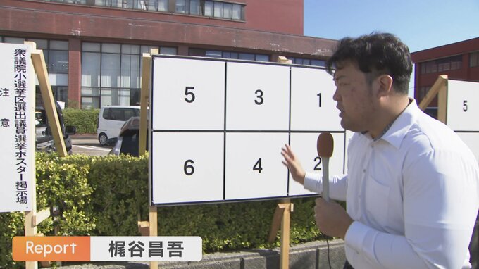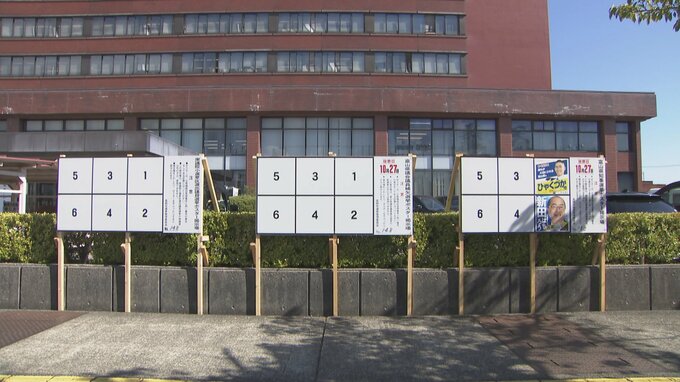 梶谷昌吾記者:「市役所前にはすでに3つの選挙ポスターの掲示場が設置されていますが、衆院選のもののみ投票日が記載されていません」