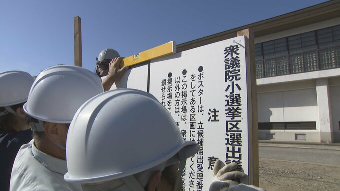 高岡市内では11日朝、市の選挙管理委員会から委託を受けた業者の作業員が衆院選立候補者のポスターを貼る掲示板の設置作業に追われていました。