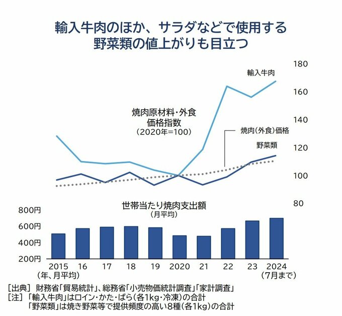 焼肉店を巡る経営環境は、食材が軒並み高騰する一歩で、メニューの値上げが難しい「我慢比べ」の状態が続いています。