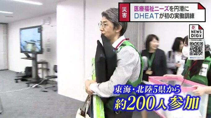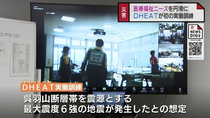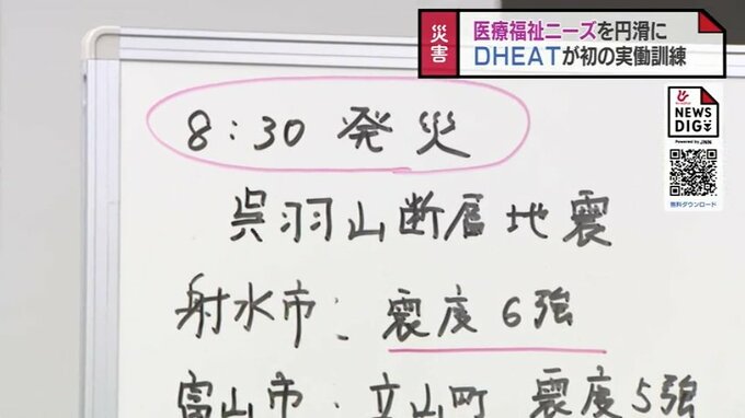 東海・北陸5県から災害時健康危機管理支援チームDHEATが20日富山市に集まり、震度の地震を想定した実働訓練をおこないました。