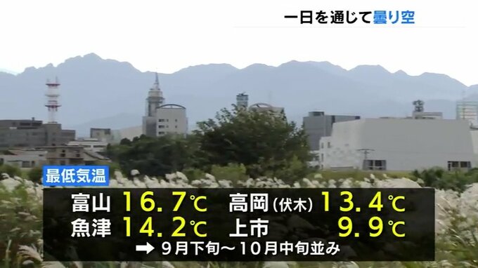 今季の最低気温を観測した21日から一転、冷え込みは緩み、けさの最低気温は富山で16.7℃と、きのうより8℃以上高くなったほか、高岡市の伏木で13.4℃、魚津で14.2℃などこの時期らしい気温となりました。