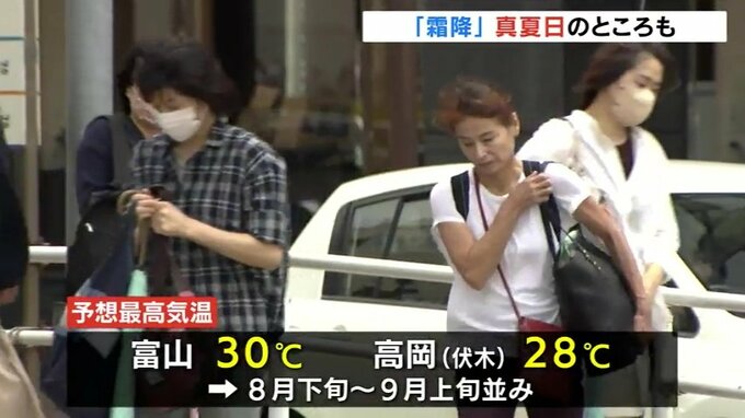 季節外れの暑さに、街では上着をもって歩く人の姿が目立ちました。日中の予想最高気温は富山で30℃、高岡市の伏木で28℃と8月下旬から9月上旬並みとなる予報です。