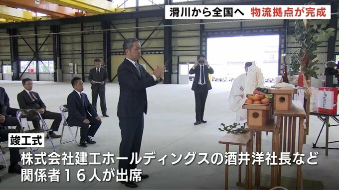 26日の竣工式には、「建工ホールディングス」の酒井洋社長など関係者16人が出席し、安全で迅速な物流事業を祈りました。