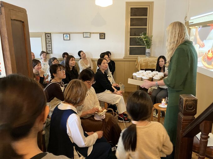 ワークショップには定員いっぱいの30人が集まり、鍋島さんの友人のデンマーク人、ディテ・ダイゴーさんが進行役となって、飲み物とお菓子を味わいながら語り合う「ヒュゲ」のスタイルで始まりました。