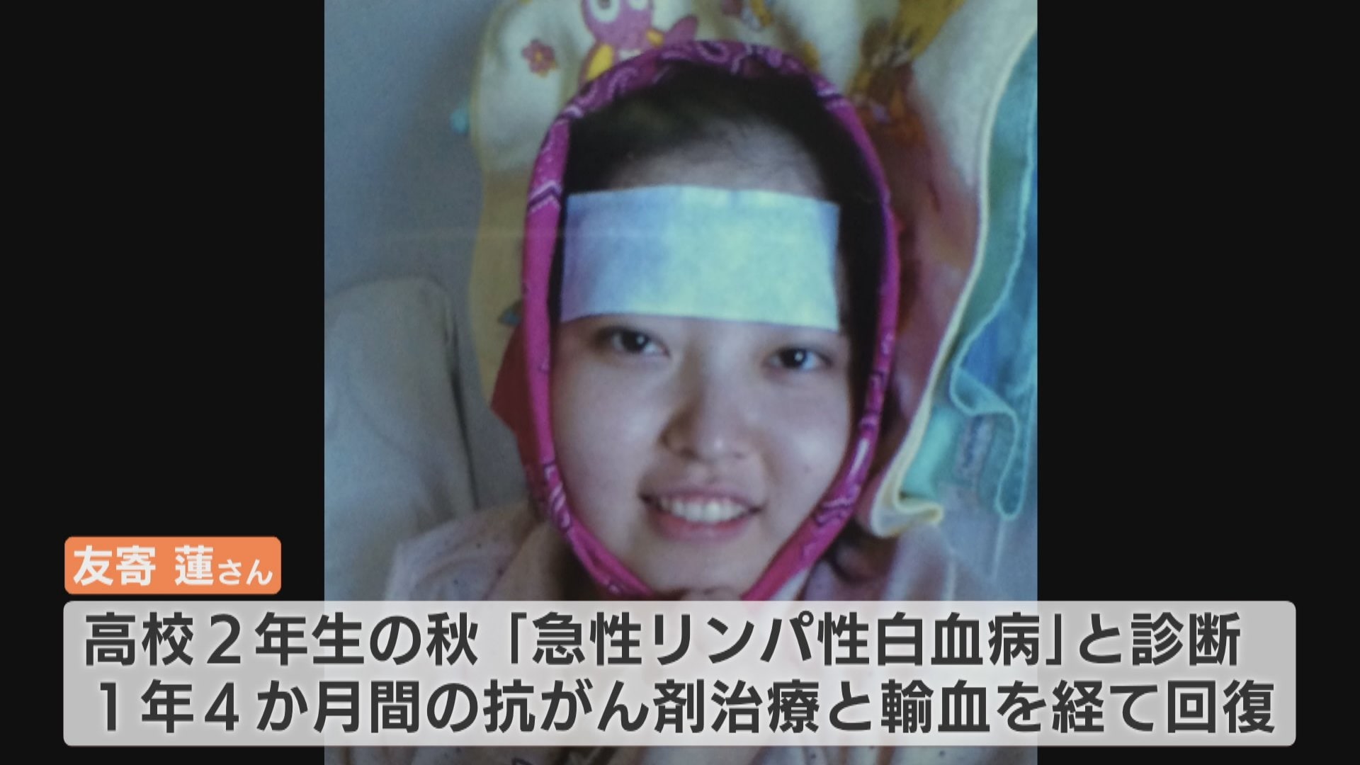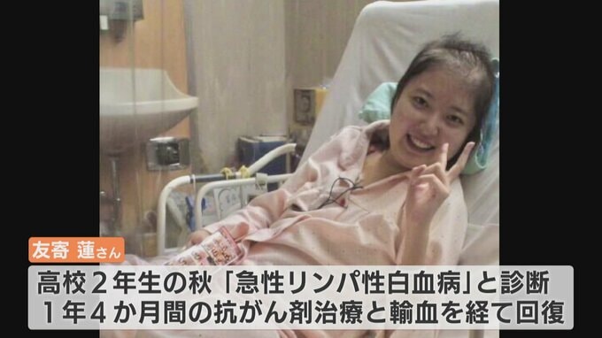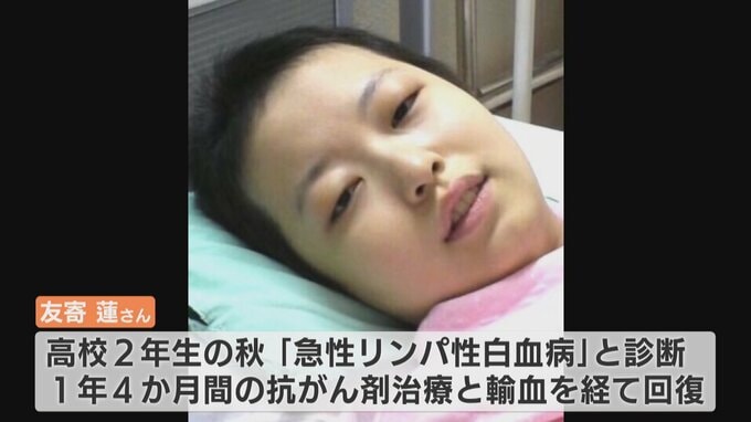 友寄さんは高校2年生の時、10万人に1人が発症すると言われている “急性リンパ性白血病” と診断され、およそ1年4か月間にわたる抗がん剤治療と輸血を経て回復しました。