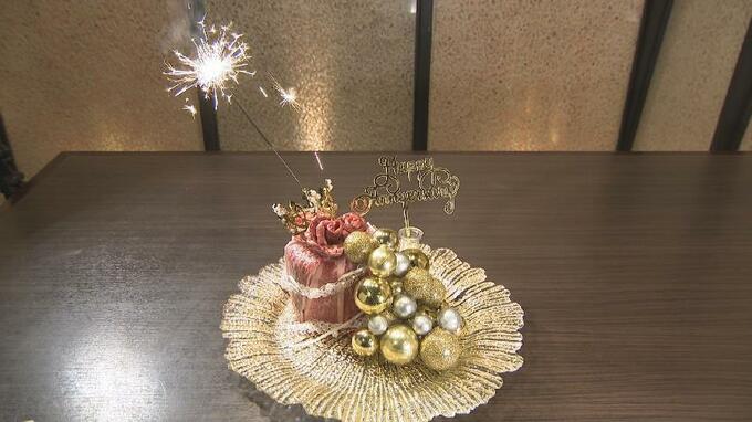 飯田さんが運んできたのは1日1組限定のメニュー、キラキラ光る花火とともに登場した真っ赤な肉をバラのように飾り付けた肉ケーキです。