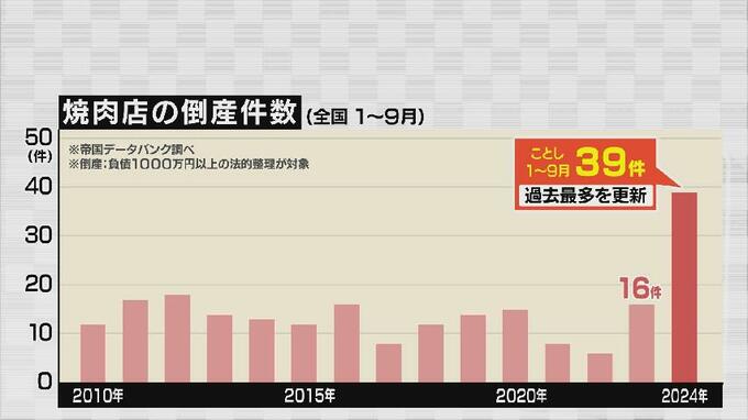 帝国データバンクによりますと、ことしの全国での焼肉店の倒産件数はことし9月末時点で39件で、前年の同じ時期の2倍以上で、過去最多となる見通しです。