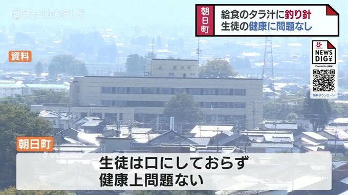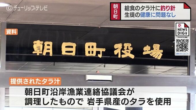 朝日町によりますと、7日、朝日中学校の給食で提供されたタラ汁の中から、長さ約5センチの釣り針1本が混入していたことがわかりました。