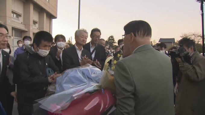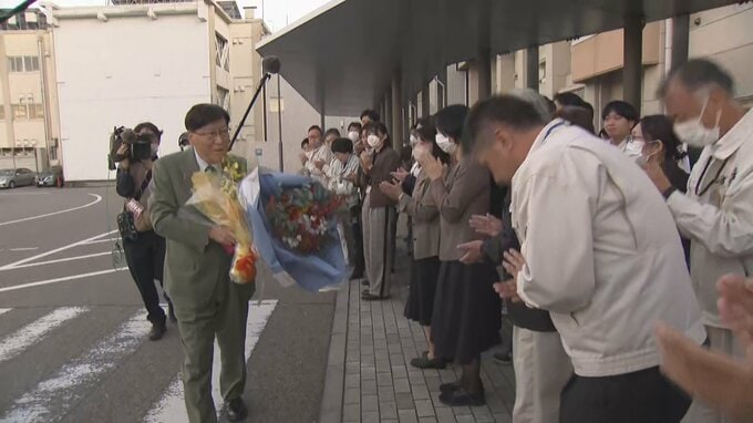 林市長は氷見市役所の玄関前に集まった大勢の市民と職員らに感謝の言葉をかけてまわり、温かい拍手で見送られながら市長としての仕事を締めくくりました。