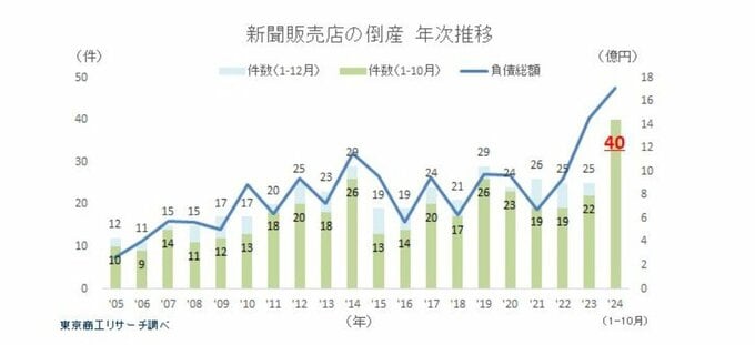 新聞販売店の倒産が2024年1月から10月までで40件に達し、年間最多だった2014年と2019年の29件を抜き、年間件数の最多を更新していることが東京商工リサーチの調べでわかりました。