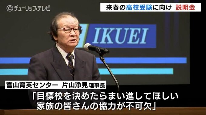 富山育英センターの片山浄見(かたやま・じょうけん)理事長は「目標校を決めたらそれに向かってまい進してほしい。それには家族の皆さんの協力が不可欠です」と受験生と保護者を激励しました。