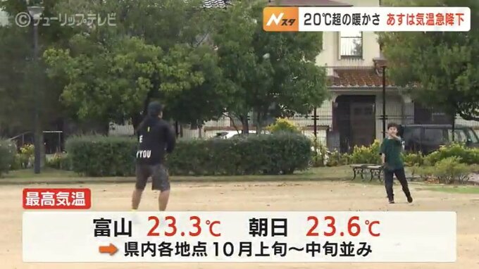 日中の最高気温はこの時期にしては高く、朝日で23.6℃、富山で23.3℃など県内各地で10月上旬から中旬並みの暖かさとなりました。