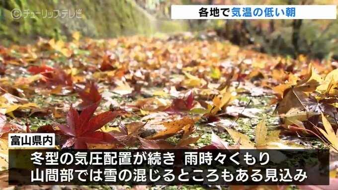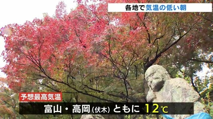 18日朝の県内の最低気温は富山で9.4℃、高岡市伏木は9.3℃、上市で6.6℃など、17日よりも2~3℃下がり、各地で11月上旬から中旬並みとなりました。