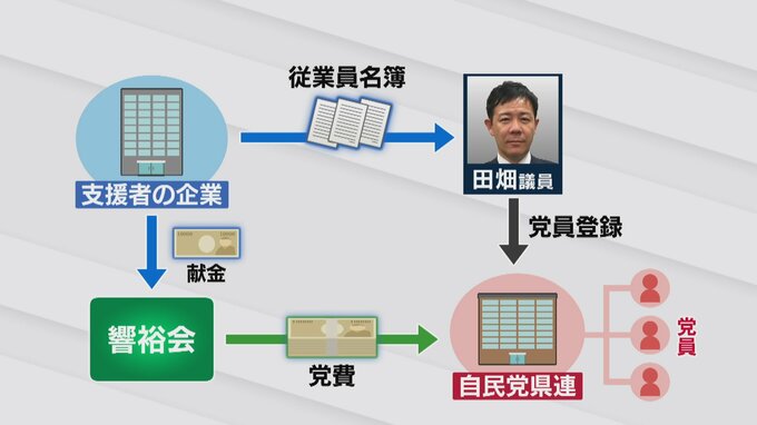 それによりますと、支援者が勤める企業の従業員名簿をもとに、田畑議員が本人に無断で自民党員に登録。田畑議員の支援企業でつくる後援会、響裕会が企業から集めた『献金』を党費の支払いに充てていたとしています。