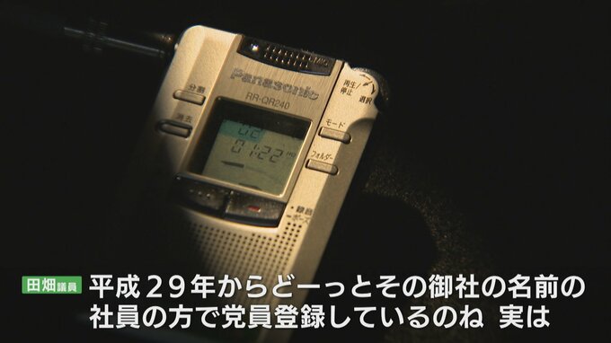 「俺、記録を見るとね。平成29年からどーっとその御社の名前の社員の方であのー、党員登録してるのね、実は」