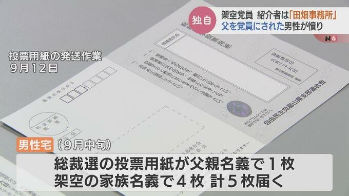 こう話すのは富山市内に住む50代の男性です。9月中旬、自民党総裁選の投票用紙が父親名義で1枚、架空の家族名義で4枚、合わせて5枚届いたといいます。