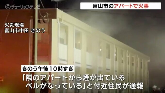 ニュースクリップ 住宅街の木造アパートで火事 けが人はなし 富山 2024年11月26日(火) 12:17 国内 25日夜、富山市の住宅街の木造アパートの一室から火が出ました。この火事によるけが人はいませんでした。25日午後10時すぎ、富山市中田一丁目で、「隣のアパートから煙が出ている。ベルがなっている」と近くの住む…
