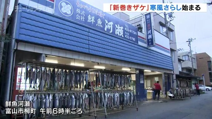 富山市の「鮮魚河瀬」で30年以上続く冬の風物詩、新巻ザケの寒風さらしです。