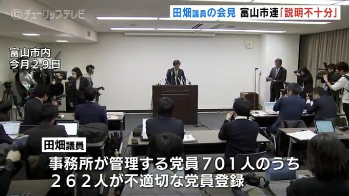 田畑議員は会見で、事務所が管理する党員701人のうち、262人が不適切な党員登録だったと公表したうえで、親族が2つの企業の従業員などを無断または架空で党員登録し、党費を支払っていたとしました。