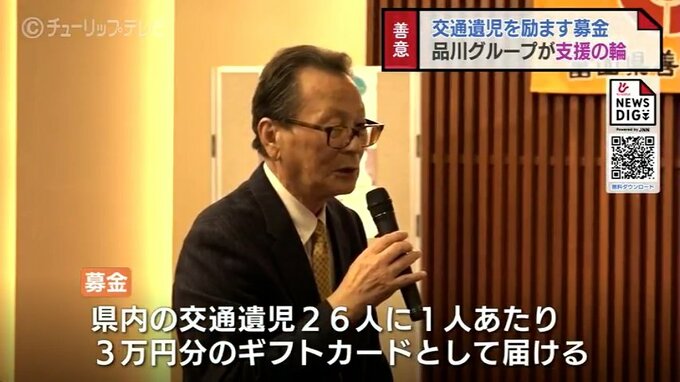ニュースクリップ 交通事故で親を亡くした子どもたちへ 自動車販売店など展開する品川グループが募金 富山 2024年12月4日(水) 20:23 国内 交通事故で親を亡くした子どもたちを支援する募金約78万円が4日、富山県善意銀行に贈られました。募金は県内で自動車販売店などを展開する品川グループが毎年、従業員や県内の店舗や事業所を訪れた人から集めたも…