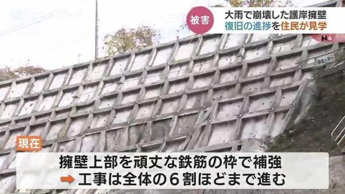 河川国道事務所によりますと現在、擁壁上部を頑丈な鉄筋の枠で補強するなどし全体の約6割まで進んでいるということで、今年度末の完了を目指しています。