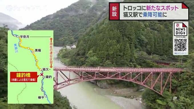 黒部峡谷鉄道トロッコ電車の「猫又駅」は、黒部峡谷の関係者だけが使う通過駅でしたが、2024年1月1日の能登半島地震により、黒部川上流側の「鐘釣橋」が損傷、今シーズンは手前の「猫又駅」で折り返し運行していました。