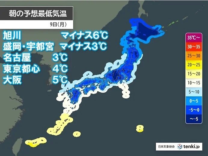 日本気象協会tenki.jpによりますと、きょう9日も寒気が居座り、8日より冬日地点はさらに増える見込みです。北海道は広い範囲で冬日、関東の平野部でも0℃を下回る所がありそうです。名古屋は3℃、東京都心も4℃と霜がおりるほどの寒さになります。通勤・通学の際は厚手のコートにマフラーなど防寒をしっかりと行ってください。