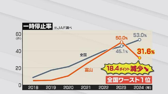 これによりますと、調査が公表された2018年以降、富山県の一時停止率は年々上昇していて、去年、はじめて全国平均を上回りました。