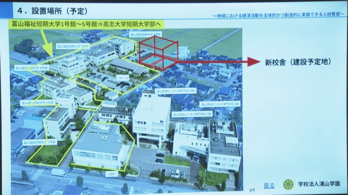 富山県射水市の富山福祉短期大学のキャンパス内に建設を予定し、学部は経済経営学部・経済経営学科のみで入学定員は95人です。