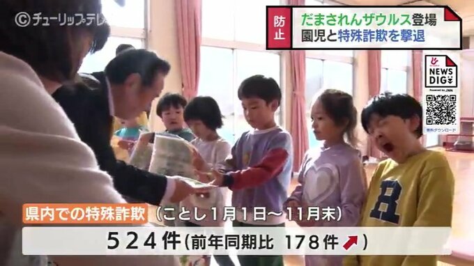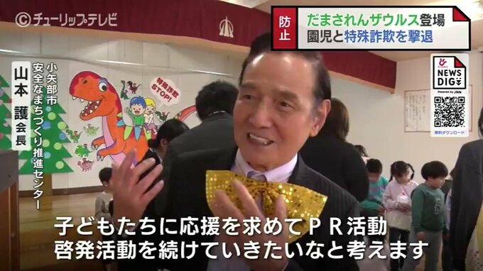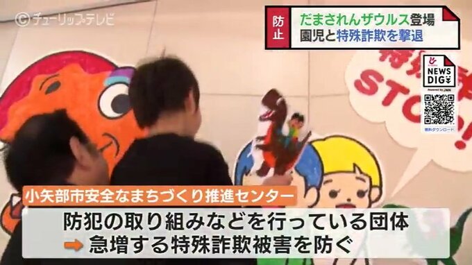 こども園に現れた巨大な恐竜?詐欺の被害防止を呼びかけるその名も「だまされんザウルス」です。これは日ごろ防犯の取り組みなどを行っている団体が急増する特殊詐欺被害を防ごうと行われたものです。