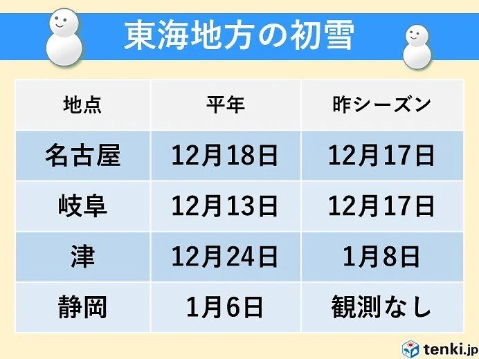 日本気象協会 tenki.jpによりますと、今週は初霜・初氷の便りが続々と届きました。今シーズンは、名古屋市や岐阜市など平野部では、まだ初雪は観測されていません。