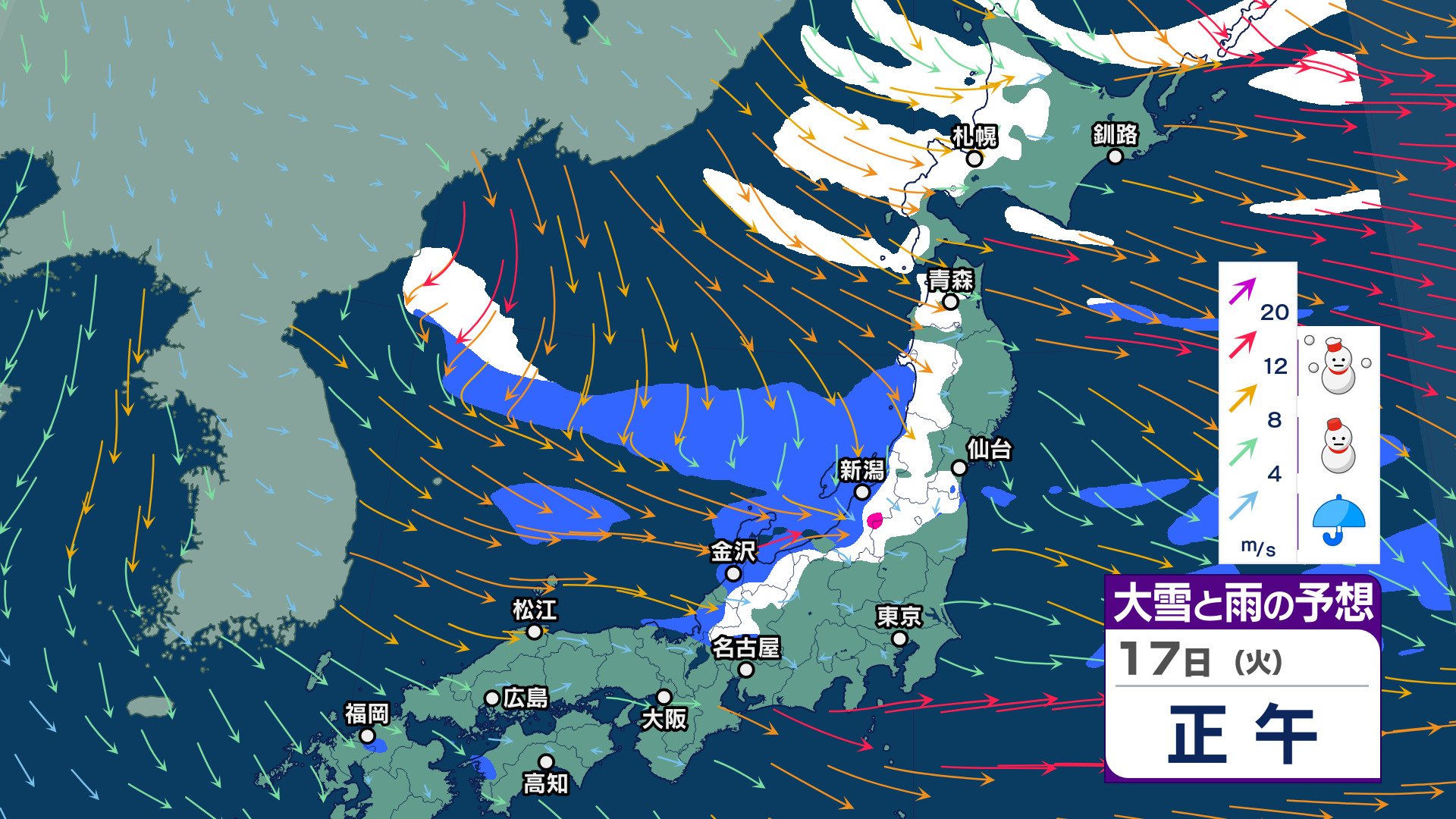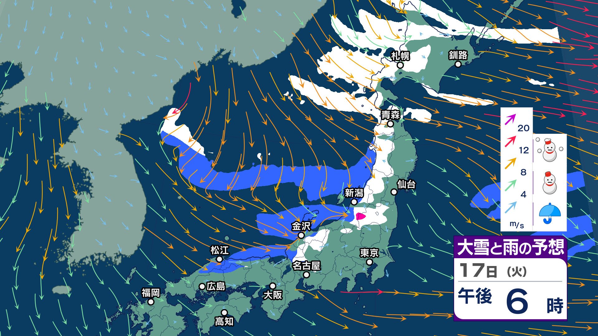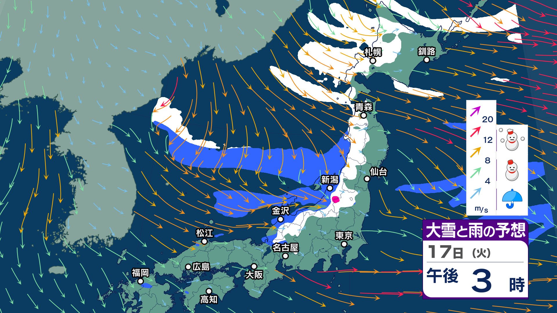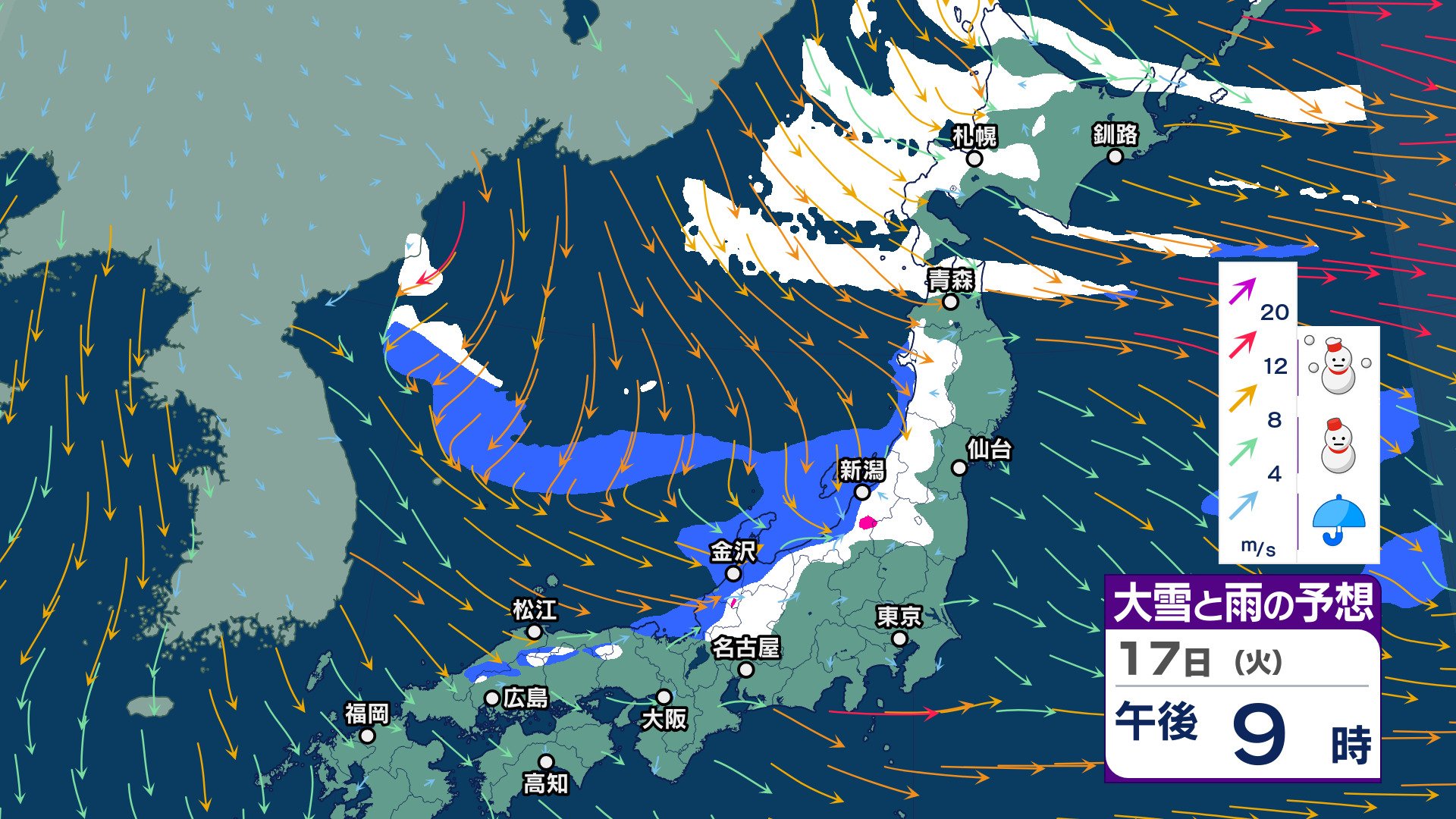 ニュースクリップ 日本海寒帯気団収束帯(JPCZ)発生…平地に雪降らせる目安の寒気も南下【3時間ごと 雪と雨のシミュレーション】15日にかけ東北から北陸の山沿い中心に大雪に注意 2024年12月14日(土) 13:30 国内 天気 大雪と雨のシミュレーション 17日(火)