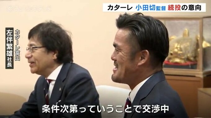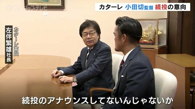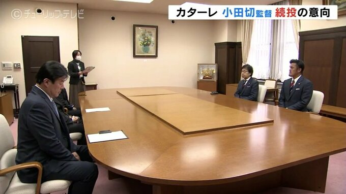 カターレ富山の左伴社長らが17日、富山県庁を訪れJ2復帰を報告しました。この席上では左伴社長から小田切監督続投の意向が示されました。