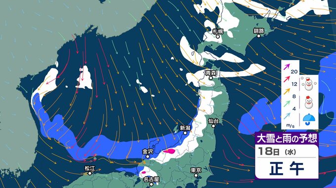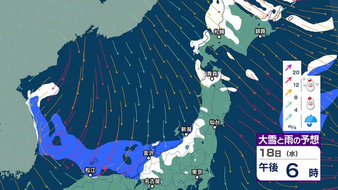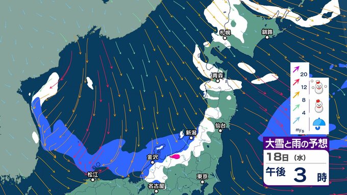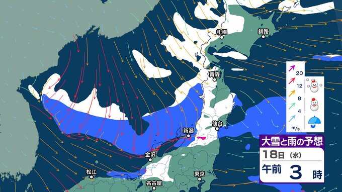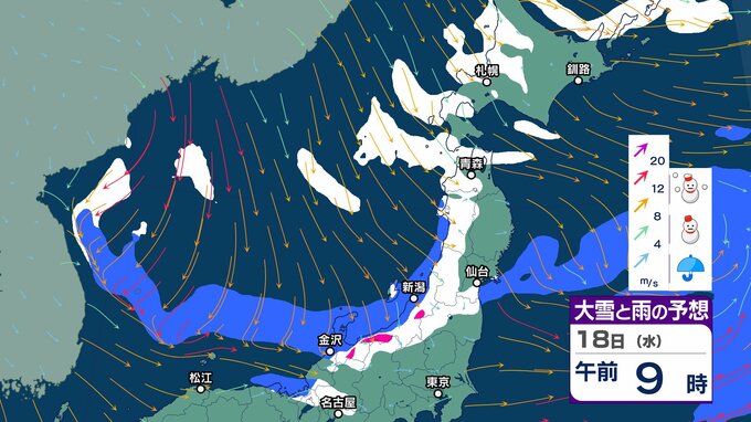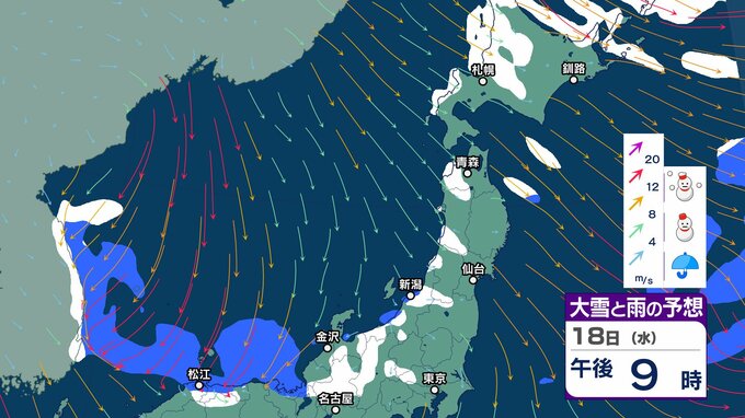 ニュースクリップ 18日にかけて寒気さらに強まる…北陸地方の上空5500メートル付近に氷点下27度以下の寒気【雪と雨のシミュレーション 3時間ごと】土砂災害、落雷や竜巻などの激しい突風、ひょうに警戒・注意 2024年12月17日(火) 21:18 国内 天気 大雪と雨のシミュレーション 18日(水)