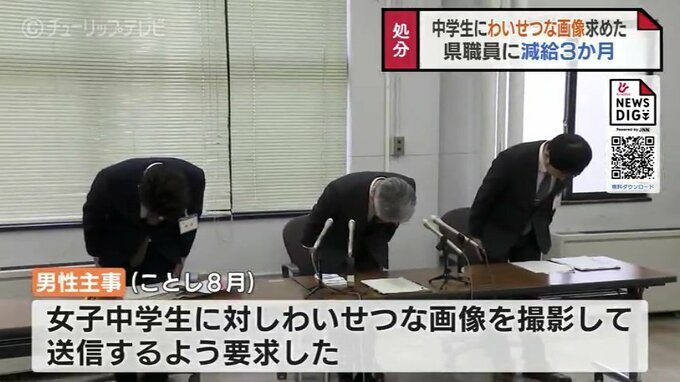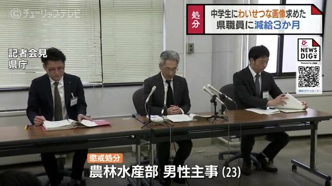 富山県は20日、女子中学生にわいせつな画像の送信を要求した疑いで逮捕されていた農林水産部所属の23歳の男性職員を12月20日付けで、3か月間の減給10分の1の懲戒処分としました。