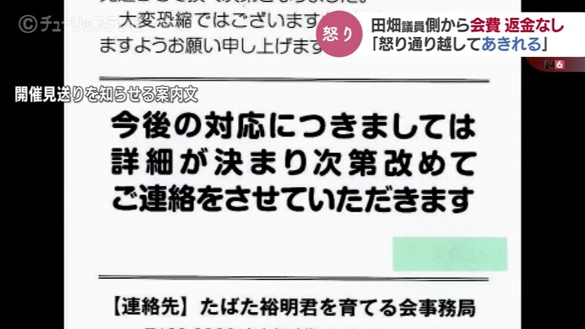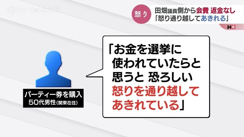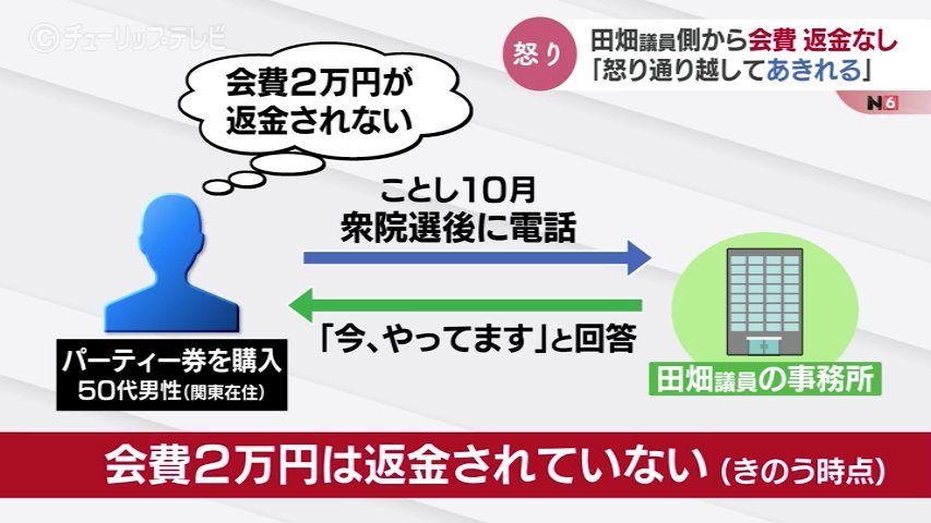 6月に中止された自民党の田畑裕明衆議院議員の政治資金パーティーについて、田畑議員は会費2万円の返金手続きを進めていると説明していました。しかしパーティー券を購入し半年以上返金されていない男性は「怒りを通り越してあきれている」と話しています。