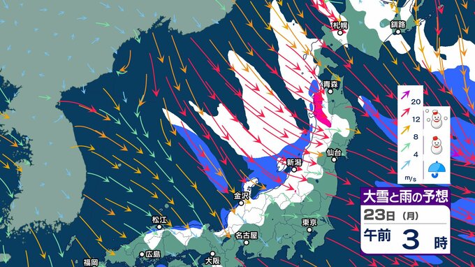 ニュースクリップ 【関東甲信気象情報】24日にかけて大雪となる見込み 栃木・群馬県に大雪警報発表 積雪深/栃木・日光市土呂部12㎝ 群馬・みなかみ町藤原71㎝ 長野・野沢温泉70㎝【 雪と雨の動き 3時間ごとシミュレーション】 2024年12月22日(日) 17:55 国内 天気 大雪と雨のシミュレーション 23日(月)