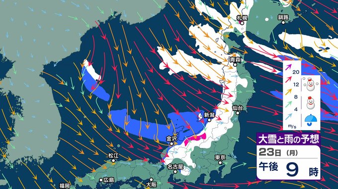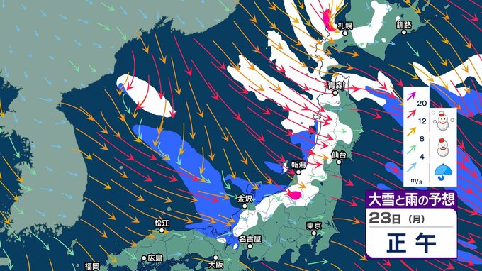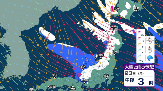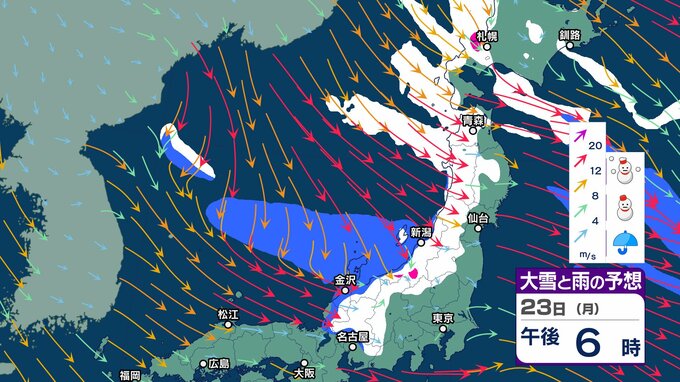 ニュースクリップ “嵐の使者” 23日も日本海側を中心に大荒れ…上空に氷点下33℃以下の強烈寒波【 雪と雨の動き 3時間ごとシミュレーション】太平洋側は晴れても冷たい風吹き込む 2024年12月23日(月) 08:01 国内 天気 大雪と雨のシミュレーション 23日(月)