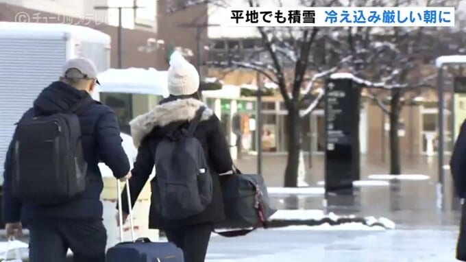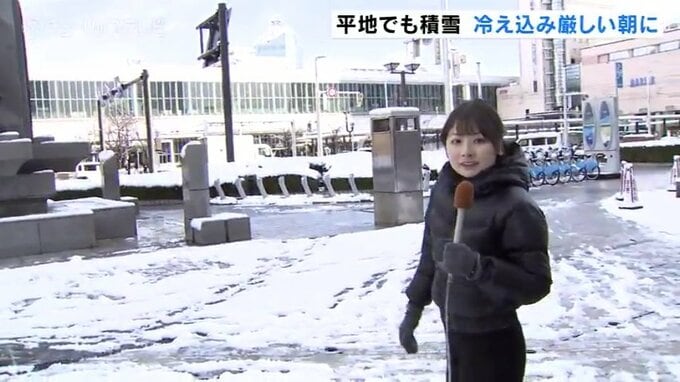 島津有希アナウンサー「富山駅前に来ています。昨夜から降った雪で、平地にも雪が積もっています」