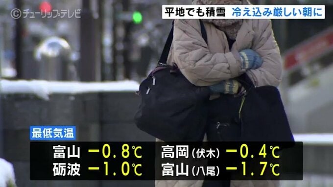 また、23日朝は厳しい冷え込みとなり最低気温は、富山で氷点下0.8℃、高岡市の伏木で氷点下0.4℃など朝日を除くすべての観測地点で0℃を下回り、5つの地点で今シーズンの最低気温となりました。