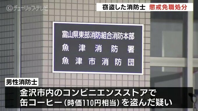 コンビニで缶コーヒー1本を盗んだ疑いで逮捕された20歳の男性消防士について、所属先の富山県の東部消防組合消防本部は23日、この男性消防士の懲戒免職処分を発表しました。