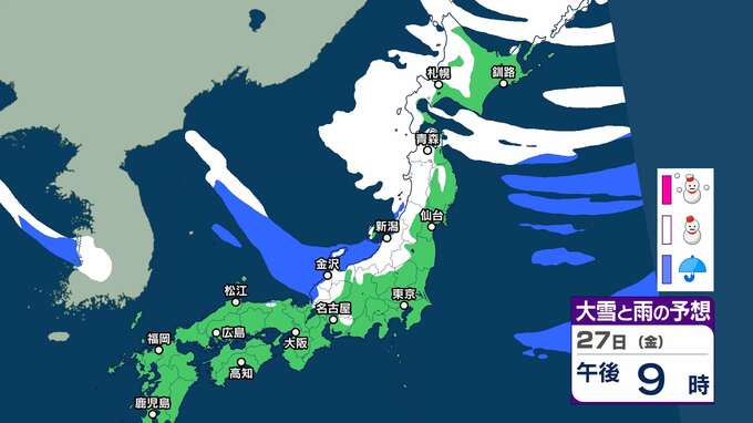 日本付近は29日にかけて強い冬型の気圧配置となり、北陸地方の上空約5500メートルには氷点下30度以下の寒気が流れ込む見込みです。北陸地方では、29日にかけて大雪による交通障害に注意・警戒してください。また、28日にかけて落雷や竜巻などの激しい突風、降ひょうにも注意してください。