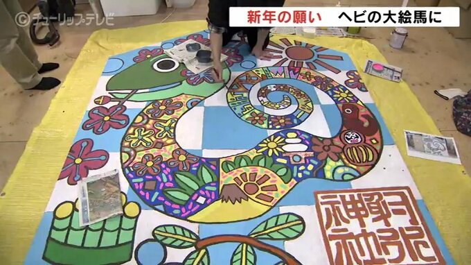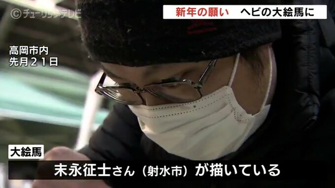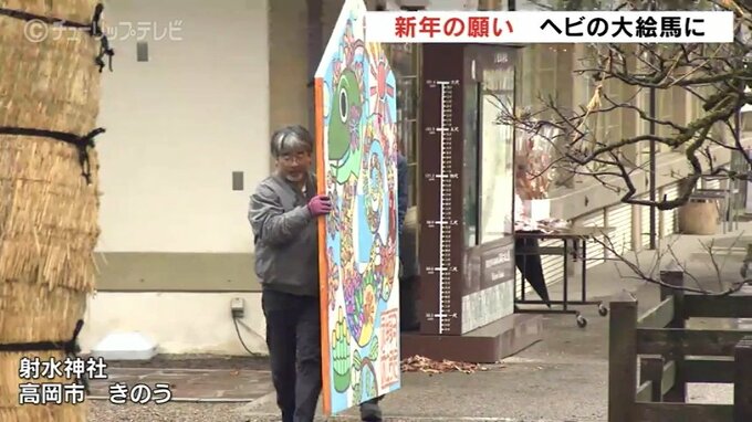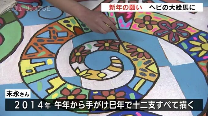 絵馬を描いたのは、「ココペリ」で活動をしている射水市の末永征士(すえなが・まさし)さんです。末永さんは、2014年の「午年」から大絵馬を手がけていて、ヘビで十二支すべての絵馬を描き上げました。