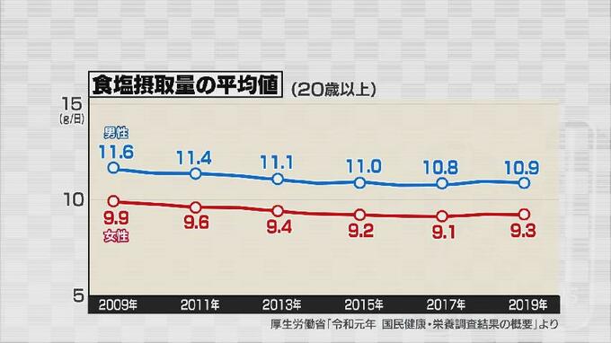 厚生労働省が発表する「日本人の食事摂取基準(2020年版)」では、塩分の摂取量の目標を食塩相当量として成人男性で1日当たり7.5g未満、成人女性では6.5g未満と設定されていますが、日本人の食塩摂取量の平均値は男性が10.9g、女性が9.3gと目標摂取量よりも多く摂取しているといいます。